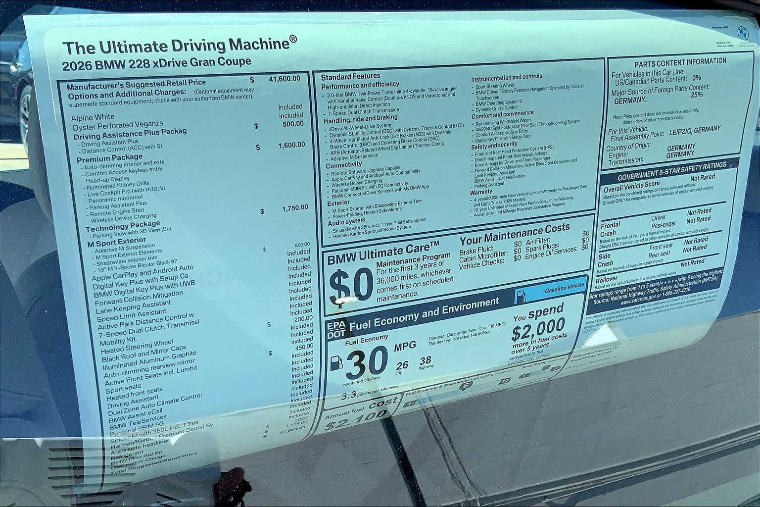 TECHNOLOGY PACKAGE drive recorder, Premium Content 1, Live Cockpit Pro, video augmented reality, real-time navigation directions, arrows and more over live video from the Surround View cameras on the central display, Head-Up Display, Parking View w/3D View (Surround View), Illuminated Kidney Grille, Parking Assistant Plus, PREMIUM PACKAGE Remote Engine Start, Black Roof & Mirror Caps, Panoramic Moonroof, WHEELS: 19 X 8.0 M Y-SPOKE BICOLOR BLACK Style 976M, Tires: 225/40R19 Summer, Increased Top Speed Limiter, DRIVING ASSISTANCE PLUS PACKAGE camera/radar based driver assist system, ACC plus Stop and Go function, basic Steering and Lane Control Assistant w/corrective steering to help the driver stay centered in the lane up to 100 mph, Driving Assistant Plus, Distance Control (ACC) w/Steering Assistant, SPACE-SAVER SPARE, HEATED STEERING WHEEL.