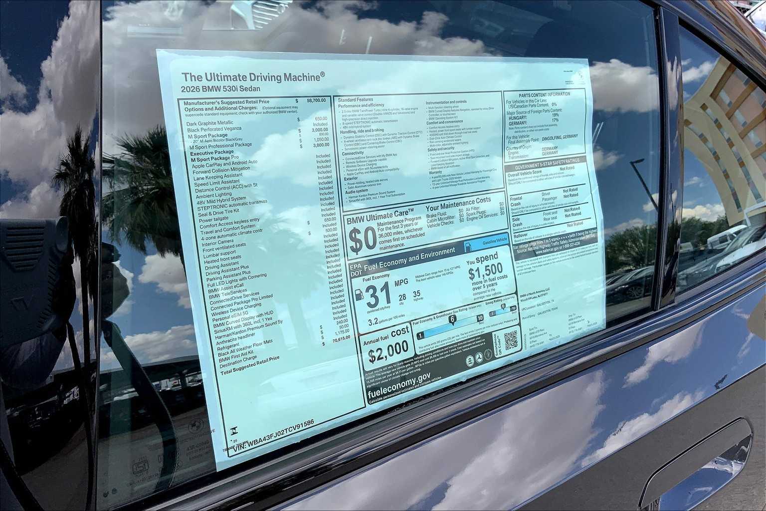 EXECUTIVE PACKAGE Remote Engine Start, BMW Curved Display w/HUD, Parking View w/3D View (Surround View), Glass Controls, Heated Steering Wheel, Sky Lounge Panoramic Roof, Interior Camera, Driving Assistant Plus, Distance Control (ACC) w/Steering Assistant, Power Rear Sunshade & Rear Side Window Shades, Premium Content 1, Parking Assistant Plus, M SPORT PROFESSIONAL PACKAGE launch control and expert mode, M Sport Package Pro, Extended Shadowline Trim, Rear Spoiler, M Sport Pro Contents, M Sport Brakes w/Red Calipers, M Shadowline Lights, BMW Iconic Glow Kidney Grille, WHEELS: 20 X 8.5 FR & 20 X 10.0 RR M BICOLOR Style 939M, Aero black/grey, Tires: 245/40R20 Front & 275/35R20 Rear All Season, Staggered, 4-ZONE AUTOMATIC CLIMATE CONTROL, FRONT VENTILATED SEATS.