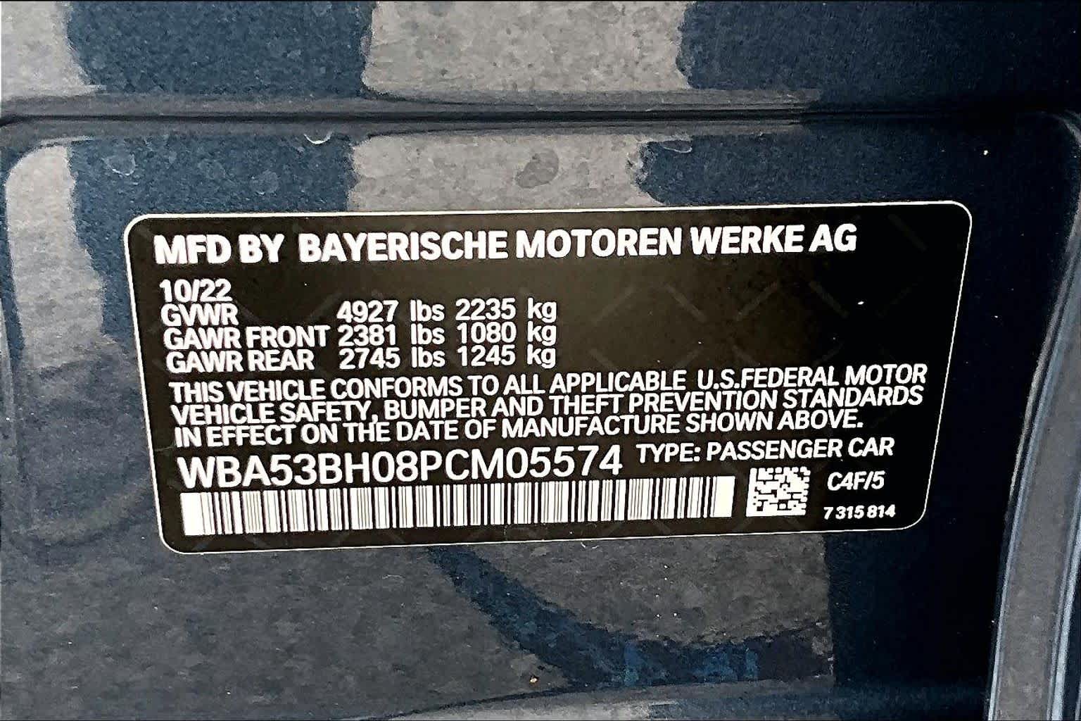 - VIN : WBA53BH08PCM05574