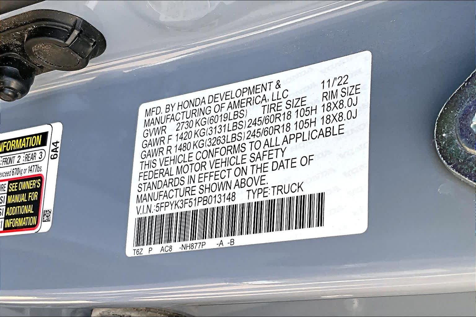 - VIN : 5FPYK3F51PB013148